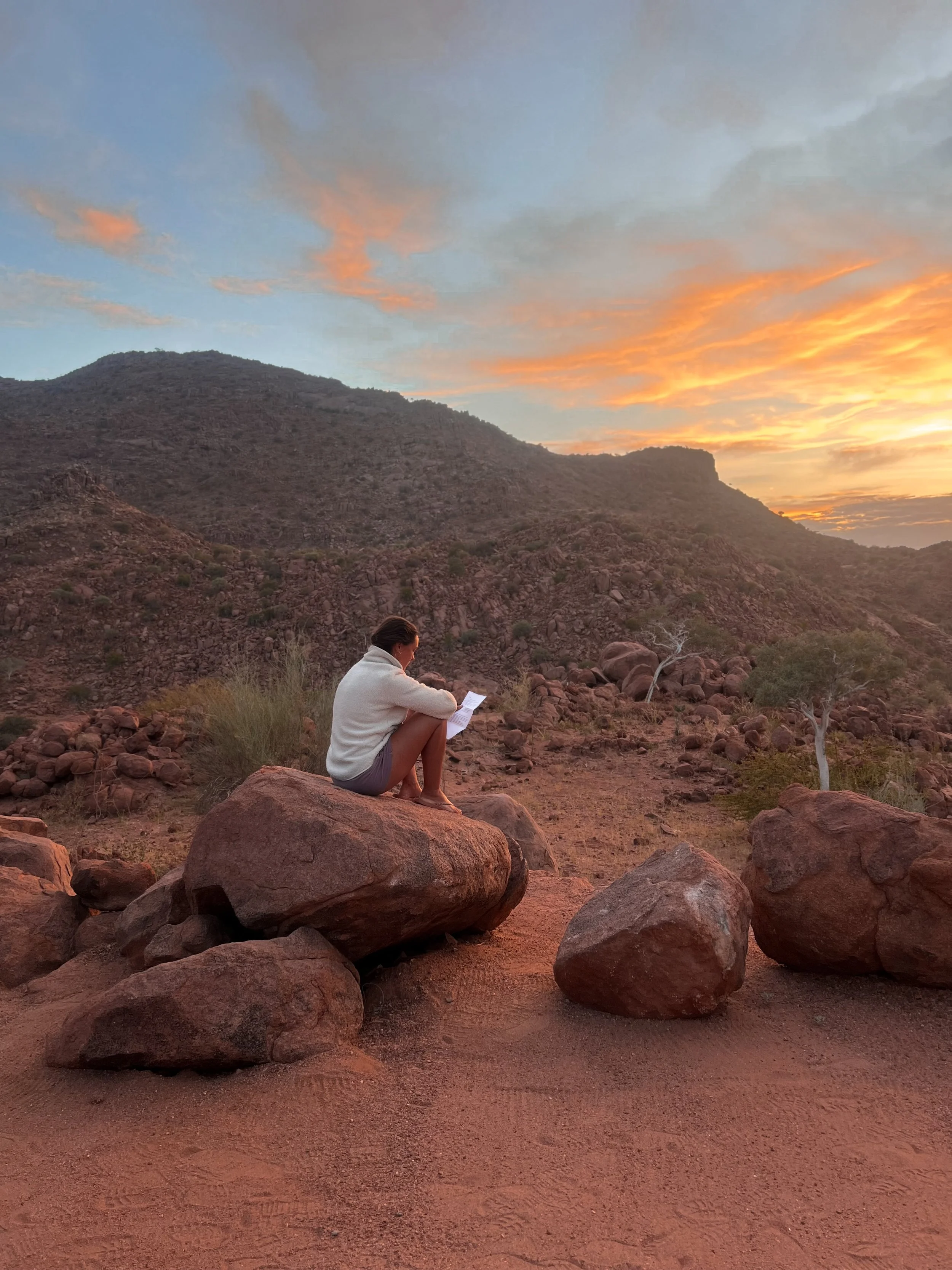 As the day softens, the landscape turns into warm terracotta tones. We watch the sun set over the rocks, perhaps shower under the open sky, before gathering for dinner around the fire. Evenings invite gentle sharing — honest conversations, quiet reflections, or simply listening, held in a space that feels warm, open and real.
